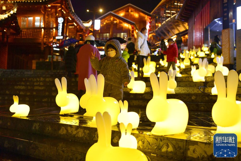 1月15日晚,人们在湖北省恩施土家族苗族自治州宣恩县城贡水河畔观赏兔元素彩灯。新华社发(宋文/摄)