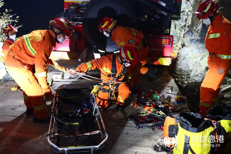 了解情况后,指挥员立即商讨救援方案并展开营救:驾驶员将车载移动照明灯具升起,对事故现场提供照明;安全员做好现场警戒拉好警戒线,防止发生二次事故;架设手做好限位保护,并制作锚点系统和下降系统;担架手制作担架水平垂直转换系统;同时岩角手主动下降,做好岩角保护,待岩角手做好岩角保护之后,担架手携带担架等所需装备器材被动下降至被困人员位置。
