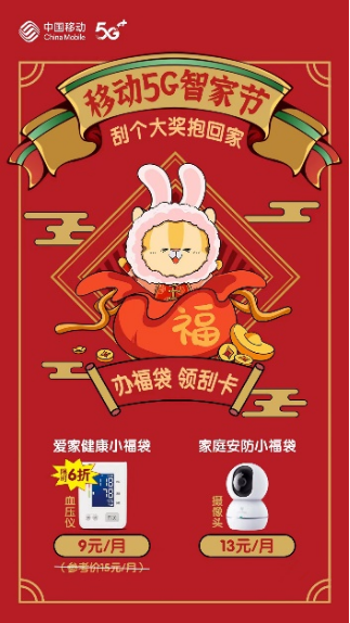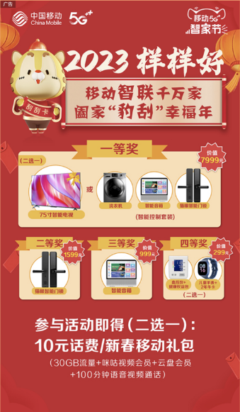 此外,云南移动5G智家节”刮刮卡”活动也在火热进行中,用户参与活动即得10元红包或者新春移动礼包,包含30GB流量、咪咕视频会员、云盘会员、100分钟语音视频通话,还有机会刮出四重大奖,其中包含多种智家产品。