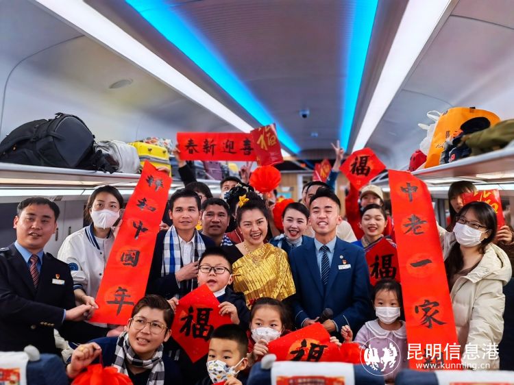 车厢里,傣族舞蹈、国粹京剧、老挝舞蹈、汉服双人舞、合唱《我和我的祖国》、茶艺、现场写春联送福字陆续登场。每一个节目都给旅客带来了欢乐,车厢里不时传出一阵阵笑声。