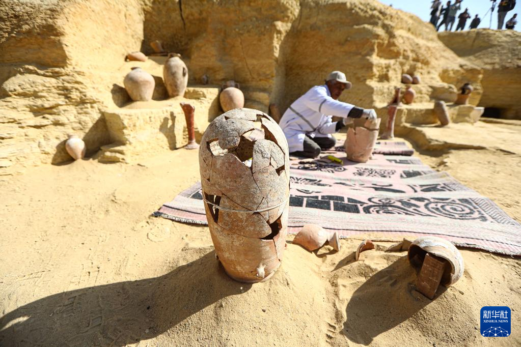 这是1月26日在埃及塞加拉地区考古发掘现场拍摄的出土文物。埃及著名考古学家扎希·哈瓦斯26日宣布,考古学家在首都开罗以南的塞加拉地区发现多座古埃及古王国时期墓葬,其中包括一具迄今为止在埃及发现的最古老、最完整的非王室木乃伊。新华社发(艾哈迈德·戈马摄)