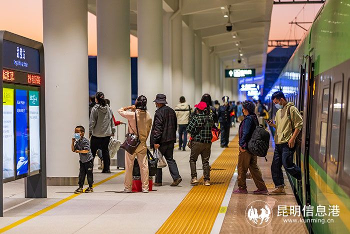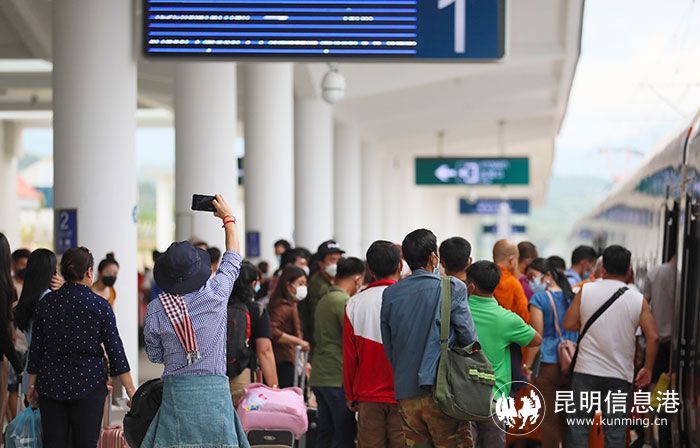 昆明站站台上,旅客准备乘坐中老铁路动车组列车出行。