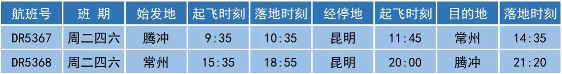 “腾冲=昆明=常州”航班班期计划为每周二、四、六执飞,航班信息如下: