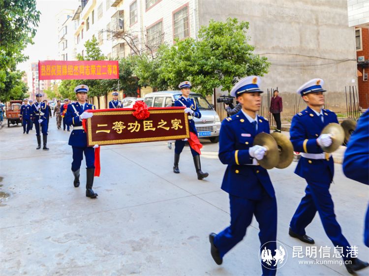 上午9时,特勤大队营区一片欢腾,全体指战员翘首以盼迎接张志顺、滕绍杰两位二等功臣的到来,荣誉感、自豪感、使命感油然而生。随后,支队顾伟译副政委、赖应博主任分别带队赴昆明市禄劝县、楚雄州牟定县,为功臣之家送上喜报和祝福。