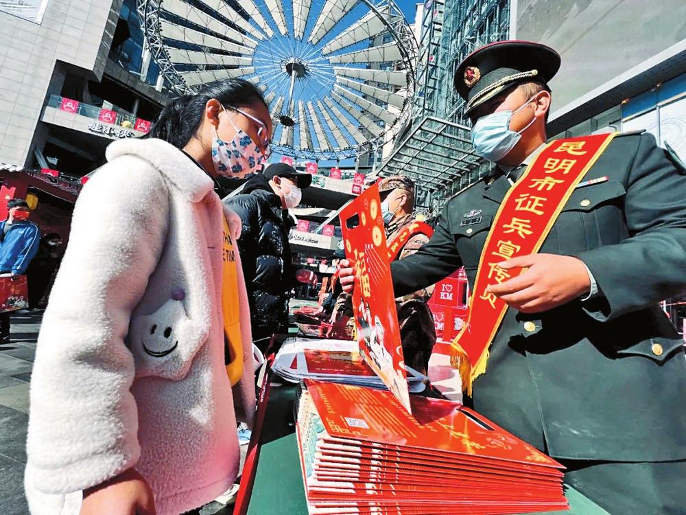 为激发辖区适龄青年应征入伍积极性和参军热情,确保今年征兵工作顺利开展,春节前后,昆明市多地集中开展“新春送福、政策到家”征兵主题宣传活动,面对面为应征青年答疑解惑。丽江市永胜县对辖区内适龄青年全面摸底调查,征兵工作人员深入辖区进行“一对一”精准宣传动员,对已报名的大学毕业生,指定专人逐一对接。德宏傣族景颇族自治州盈江县以线上线下结合的方式宣传征兵政策,“一对一”动员跟进服务,并对有入伍意向且有实际困难的对象及时开展帮扶。红河哈尼族彝族自治州蒙自市部分乡镇邀请一级上士到各村委会开展巡回征兵宣传,极大提升了征兵宣传的感染力。