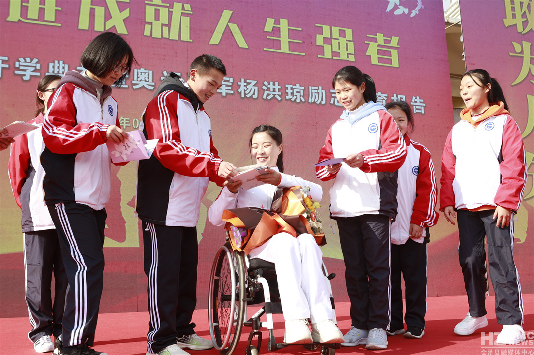 茚旺高三三班学生耿涛先天性肌无力,从小到大一直依靠轮椅生活,生活学习中遇到了很多困难,但杨洪琼的事迹深深打动激励着他:“听了杨老师的讲话,我非常感动,感动她励志的事迹,对我来说也是一种激励,我们都身为残疾人,但我们都在坚持自己的理想,我应该向她学习坚持不懈的精神,无论以后遇到什么困难都要坚持自己的理想,一直走下去不放弃。”