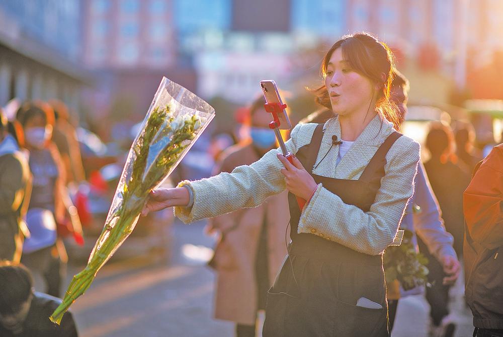 2月13日,在斗南花卉交易市场,主播毕茜茜为顾客介绍鲜切花。 新华社记者江文耀/摄