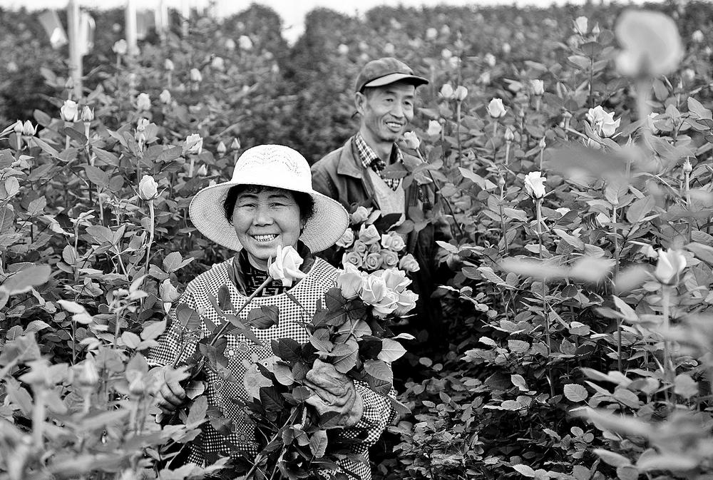 在晋宁康龙花卉公司种植基地,花农开心地采收外销高品质玫瑰。 记者杨峥/摄