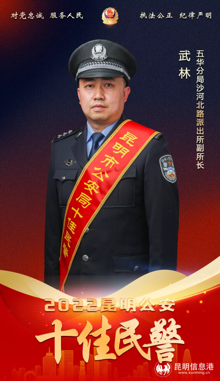武林,男,35岁,中共党员,沙河北路派出所副所长、案件办理中队长。自工作以来,武林始终不忘入警初心、牢记为民使命,用对党和人民的忠诚、对公安事业的满腔热血,全心全意的投入到日常各项工作任务中,在平凡的岗位上坚守,在无私的奉献中成长,向群众展现出一名人民警察的光辉本色。