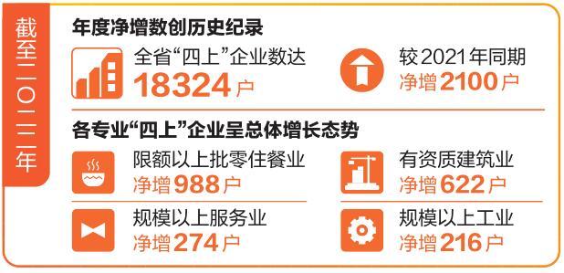 我省“四上”企业年度净增数创历史纪录。截至2022年12月,全省“四上”企业数达18324户,较2021年同期净增2100户,增长12.9%,是2021年全年净增户的1.93倍。
