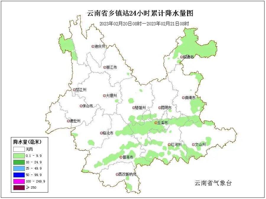 20日,昭通北部、曲靖东部、文山南部、红河南部、玉溪北部、怒江北部出现小雨,其它地区多云。午后滇西北、滇中及滇东局部出现7~8 级阵风。