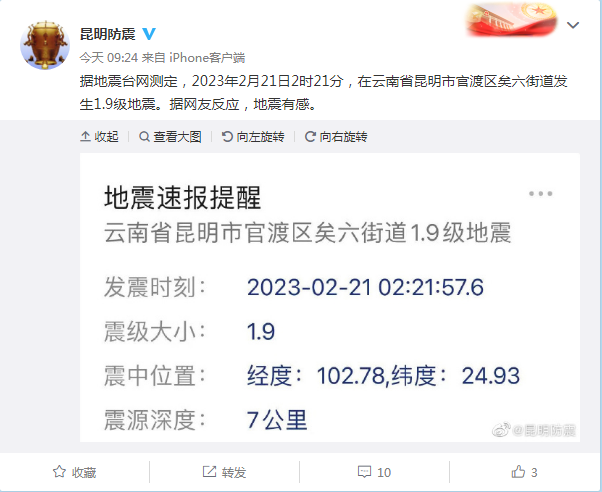 据云南省昆明市防震减灾局官方微博@昆明防震 消息:据地震台网测定,2023年2月21日2时21分,在云南省昆明市官渡区矣六街道发生1.9级地震。据网友反映,地震有感。