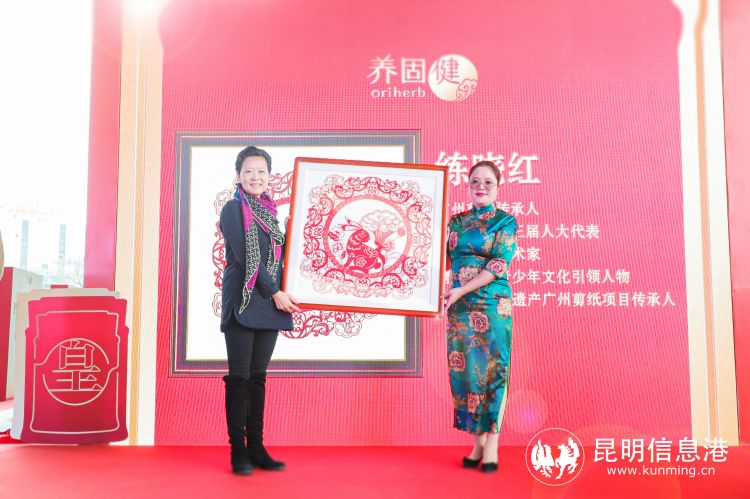 练晓红女士特别创作了剪纸作品《兔衔灵芝呈祥瑞》赠予养固健,作为回礼,养固健为嘉宾们送上了专属的养固健养生礼盒。