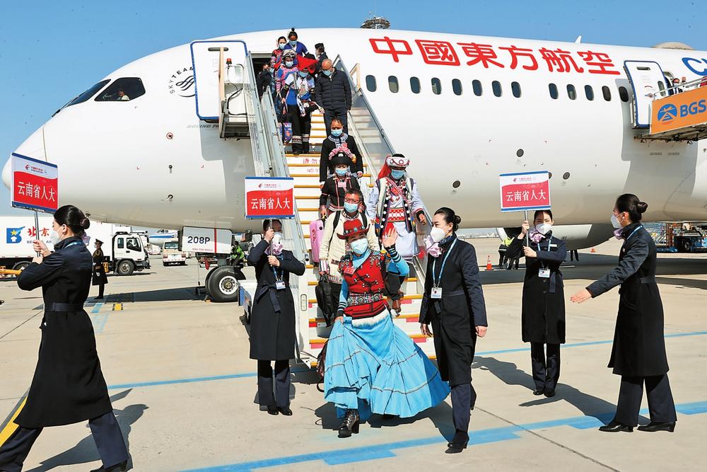 3月3日,出席十四届全国人大一次会议的在滇全国人大代表抵达北京。 云南日报记者 雷桐苏 摄