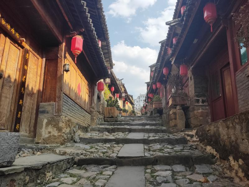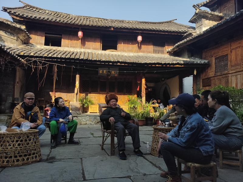 沿着基本保持原貌的“茶马古道”楼梯街一路向前,调研小组进入鲁史古镇。走进古镇,大家就被芙蓉糕、核桃糕等特色小吃,纯手工编制的竹制工艺品等特色产品所吸引。在“俊昌号”茶庄传承人骆大爷的邀请下,大家进入保存完好的骆家大院品尝特色罐罐茶。