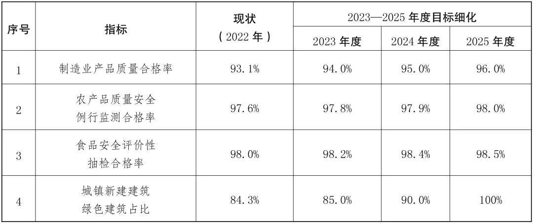 到2025年,新产品、新业态蓬勃发展,产品、工程、服务质量水平显著改善,制造业产品质量合格率提高到96%,农产品质量安全例行监测合格率达到98%以上,食品安全评价性抽检合格率保持在98.5%以上,工程质量抽查符合率不断提高,城镇新建建筑绿色建筑占比达到100%。