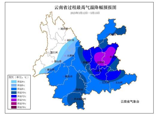 大部地区日最高气温将下降 8~10℃、局地12~14℃,昭通和曲靖北部高海拔地区有雨夹雪或小雪,曲靖东部、文山北部、红河南部、普洱、 西双版纳有小到中雨。过程期间局地伴有雷暴大风和冰雹等 强对流天气。