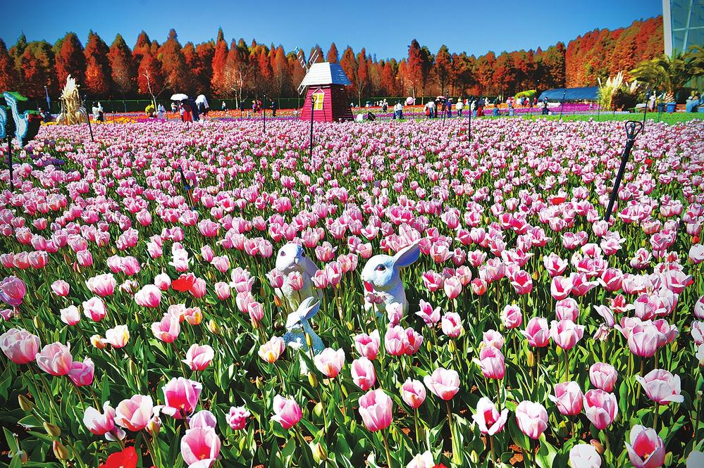 近日,昆明捞渔河湿地公园100万余株郁金香形成花海。本报记者龙宇丹/摄
