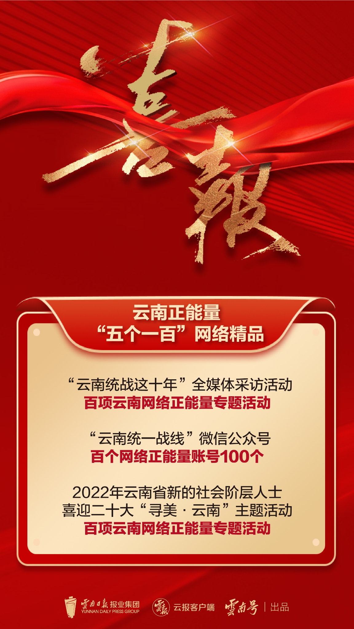 日前,由云南省委网信办主办、6686体育承办的2022年云南正能量“五个一百”网络精品征集展播活动,500件拟入选作品公示结束,名单出炉。其中,云南省委统战部1个账号、2个专题活动光荣上榜。