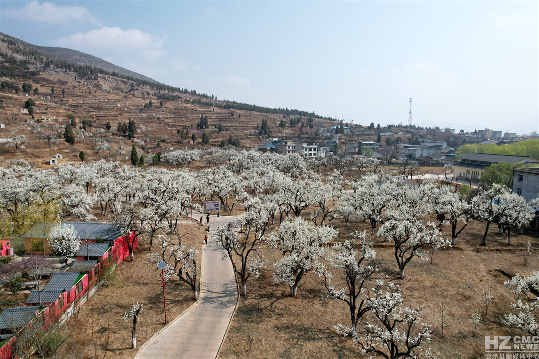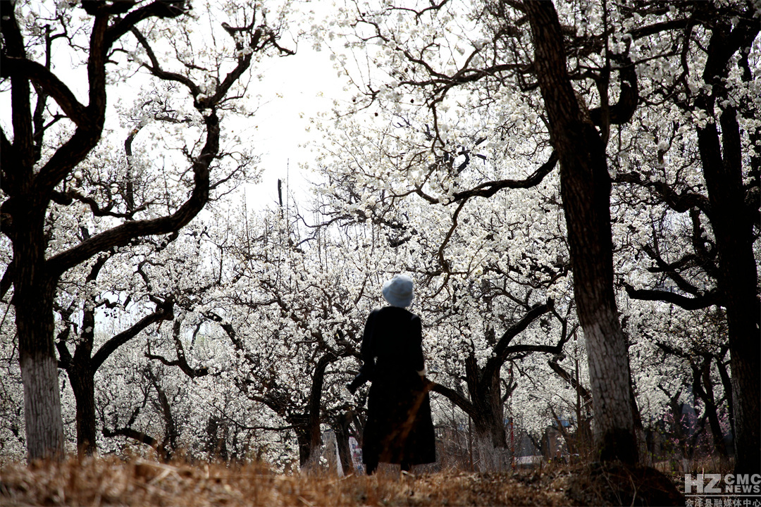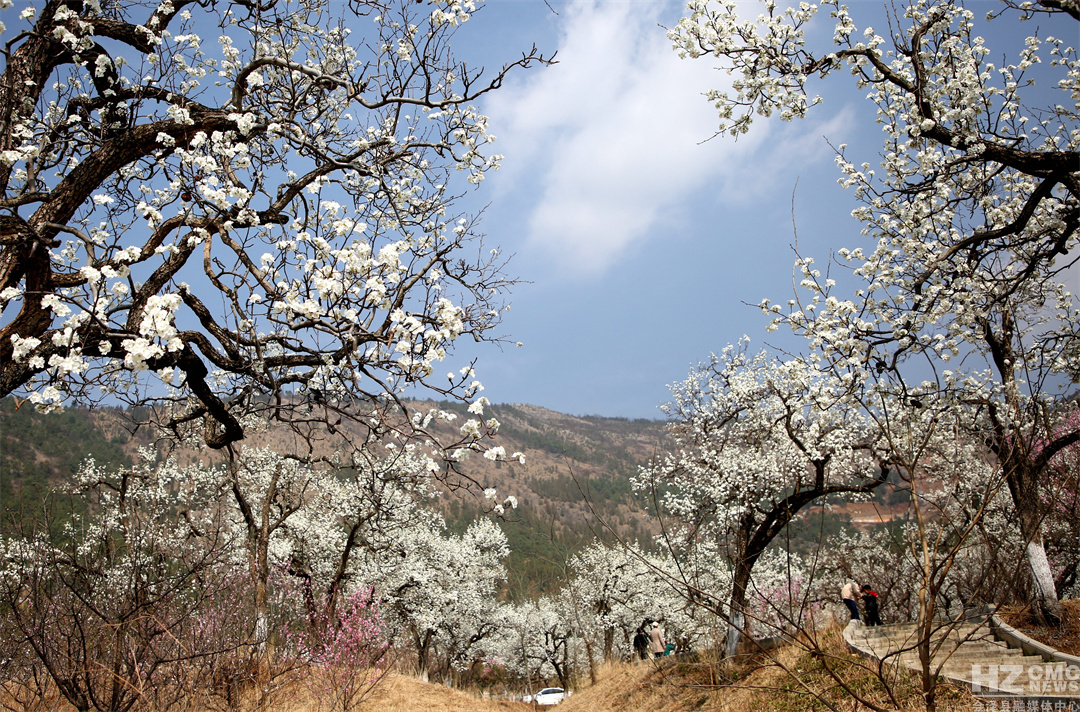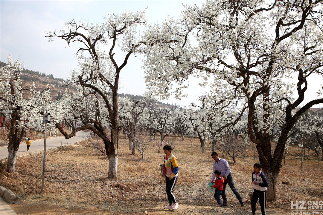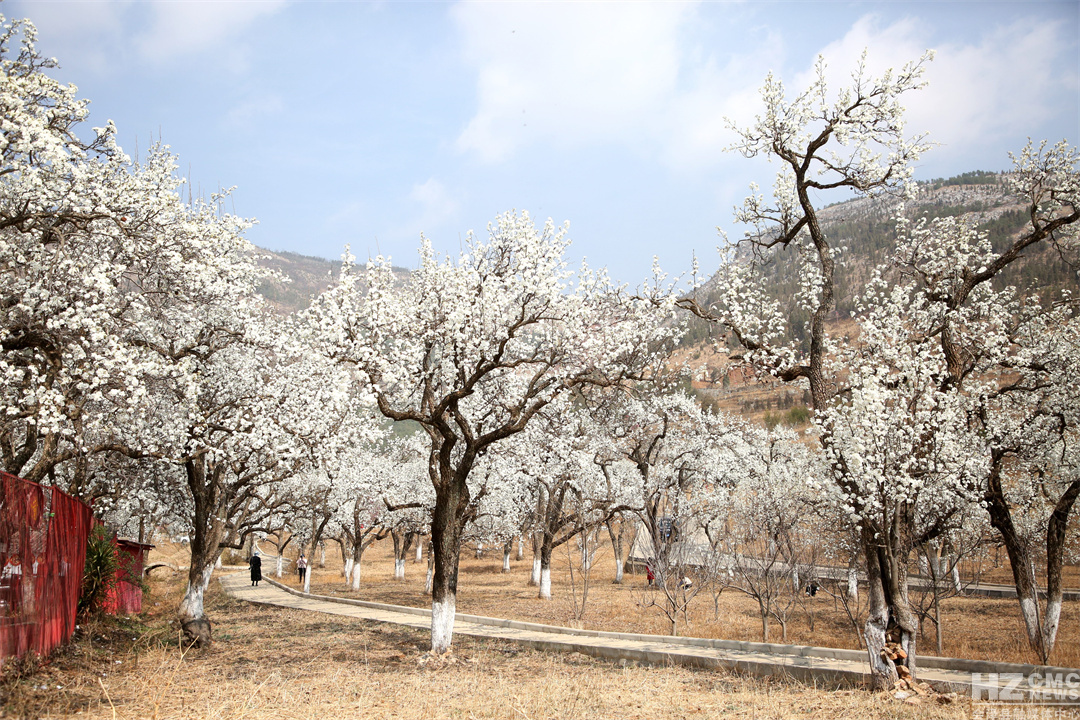 “放眼疑似白云落,风来忽见梨花雨。”远远望去,满树梨花似团团云絮漫卷轻飘,浮动在青绿的涟漪间,在蓝天白云的映衬下,仿若人间仙境。细细看去,朵朵梨花竞相吐蕊,沐浴在明媚的春光里,一阵清风过去,花瓣在微风中含烟带雨,纷纷而落,形成“梨花飞雪”的绝美风景。