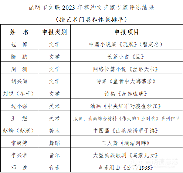 现对评选结果进行公示,本次公示期为2023年3月16日至3月22日。公示期内,如有异议,请与昆明市文联组联部联系。