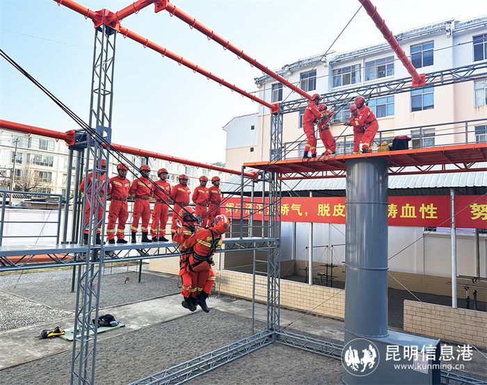 3月的永胜县城,春意盎然,在云南省丽江市永胜县森林消防中队绳索救援训练场,消防员们在班长李小平的指挥下利用绳索救援系统对受困人员进行着模拟救援训练。