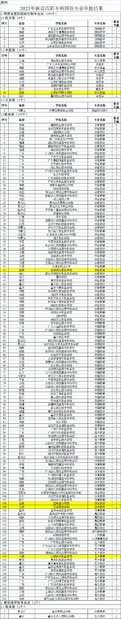 日前,教育部组织完成了2023年高等职业教育专科专业设置备案和审批相关工作,其中,同意设置的国家控制专业点云南有5个,分别是大理护理职业学院针灸推拿、云南理工职业学院学前教育、昆明城市学院 体育教育、玉溪师范学院体育教育、云南新兴职业学院艺术教育。