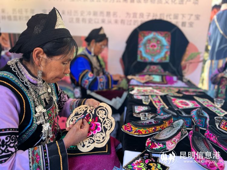图说:彝家妇女现场展示传统手工刺绣。