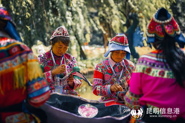 比花事更热闹的是百名绣娘绣牡丹活动。牡丹花前、柳树荫下,碧水池边,来自武定的一百余位绣娘飞针走线,一朵朵牡丹跃然布上。她们是满脸皱纹的老妪,是娇俏的少妇,还是十七八岁的姑娘,都穿着比花艳丽的衣裳,赛着这传承千年的指尖技艺。别出心裁的活动深受游客和绣娘的追捧,既是一场沉浸式的赛美赛艺,又助力广大绣娘巧手脱贫,把藏于闺中的民族民间手工艺品推向市场。还有十多位来自楚雄州各地的画家,用笔画尽满园春。