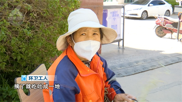 环卫工人:“摘的那棵,摘了就吃吐成一地,又脏又烦,是不是?难扫得很。”