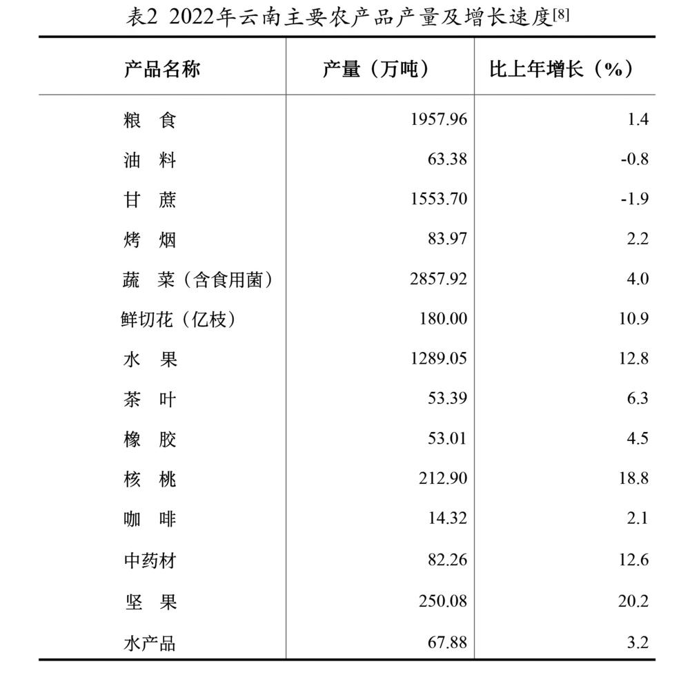 全年粮食总产量[6]1957.96万吨,比上年增长1.4%。蔬菜产量2857.92万吨,增长4.0%;水果产量1289.05万吨,增长12.8%;茶叶产量53.39万吨,增长6.3%;鲜切花产量180.00亿枝,增长10.9%;中药材产量82.26万吨,增长12.6%;坚果产量250.08万吨,增长20.2%。