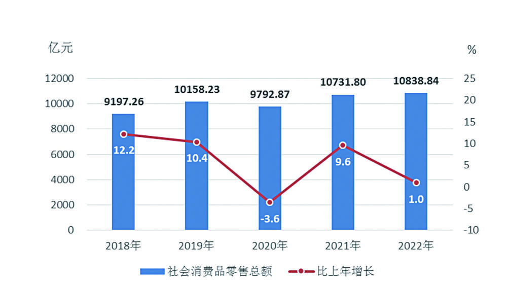 全年社会消费品零售总额10838.84亿元,比上年增长1.0%。分经营地看,城镇消费品零售额9435.19亿元,增长1.0%;乡村消费品零售额1403.66亿元,增长1.2%。分消费形态看,商品零售9322.27亿元,增长1.0%;餐饮收入1516.57亿元,增长1.0%。