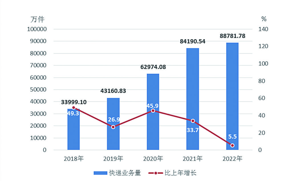 图9 2018-2022年云南快递业务量及增长速度