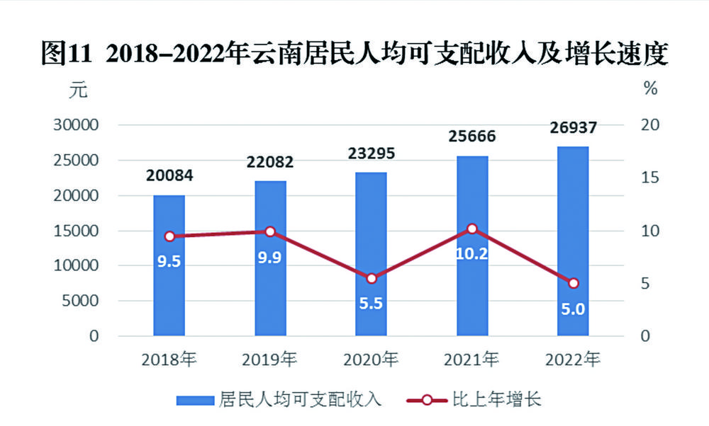 图11 2018-2022年云南居民人均可支配收入及增长速度