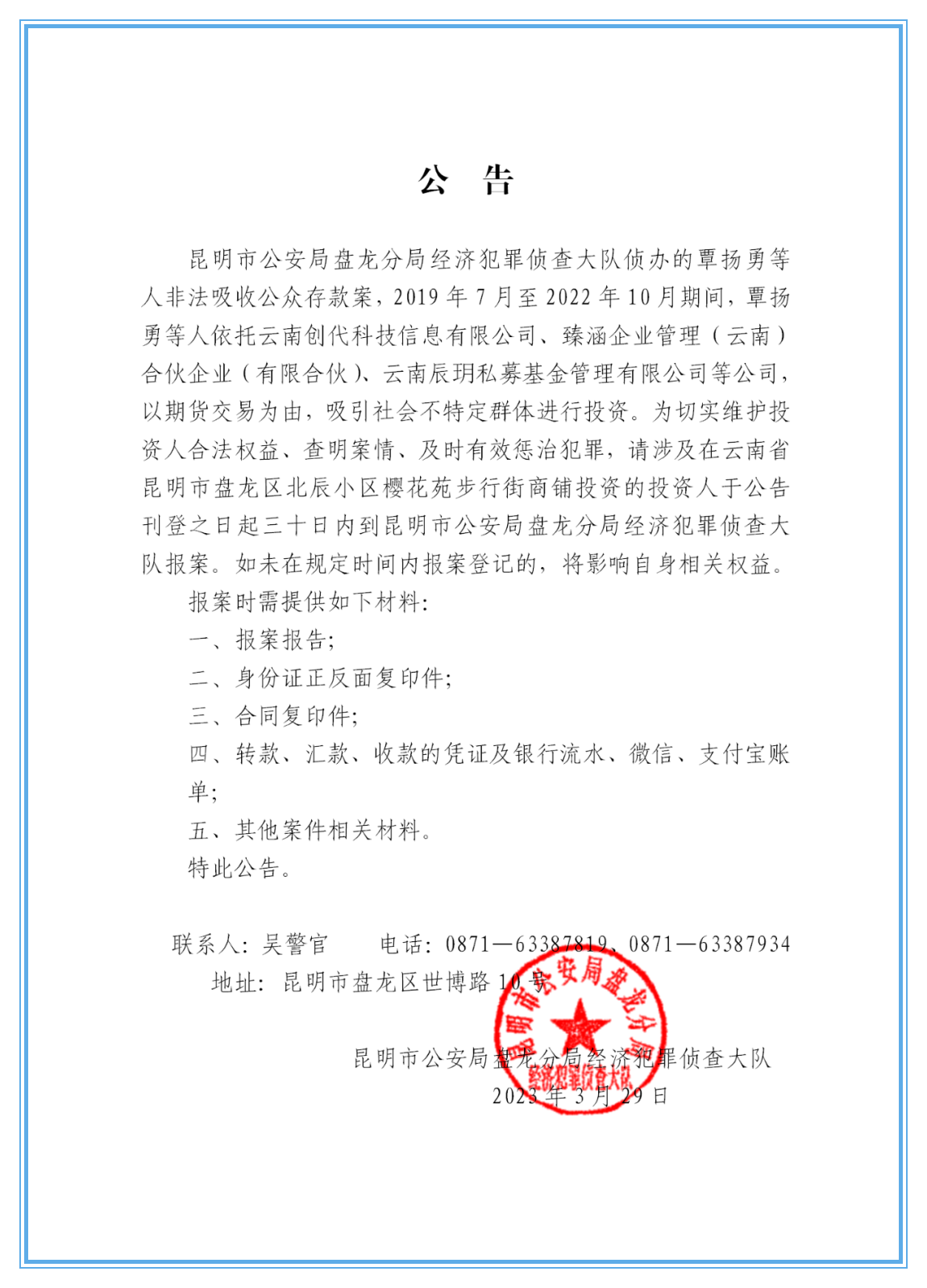3月29日,据“云南经侦”消息,2019年7月至2022年10月期间,覃扬勇等人依托云南创代科技信息有限公司、臻涵企业管理 (云南 )合伙企业(有限合伙 )、云南辰明私募基金管理有限公司等公司以期货交易为由,吸引社会不特定群体进行投资。