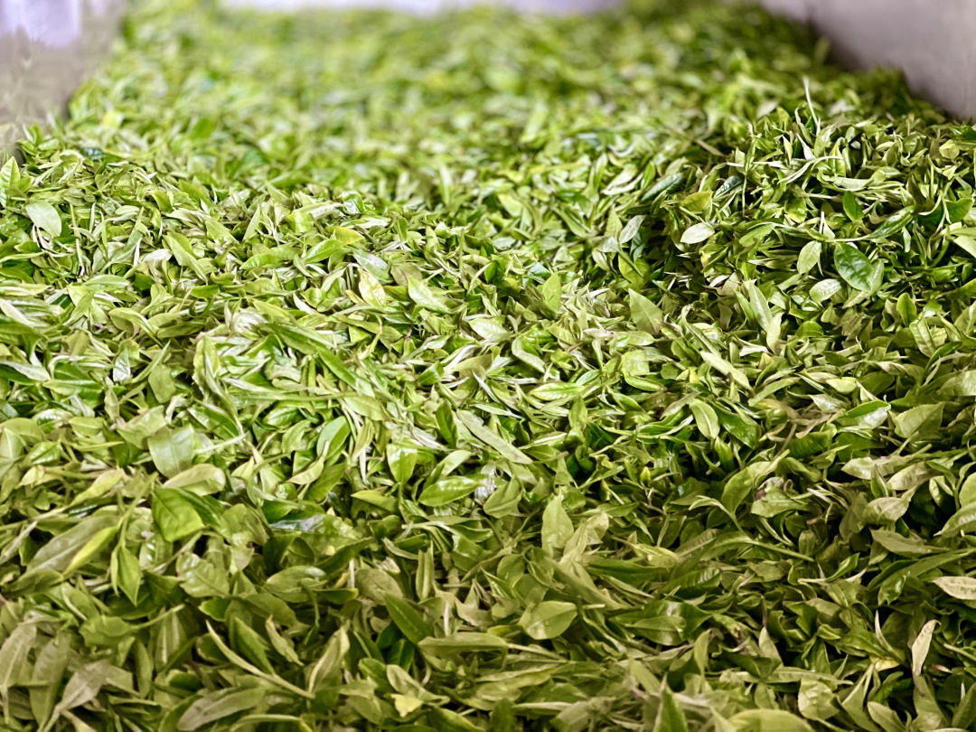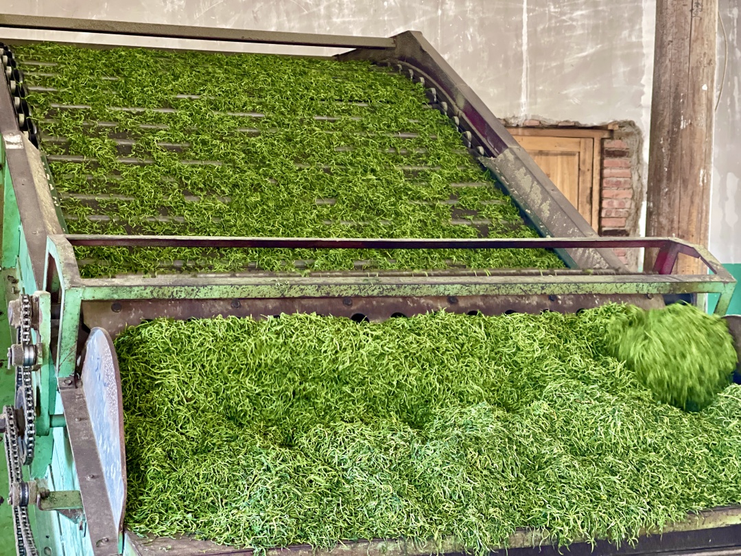 在青龙山茶叶专业合作社的车间里,采摘完的茶叶经过多道制茶工序后,变得翠绿显毫,空气中弥漫着春茶的清香,沁人心脾。据了解,现在正是茶叶采摘旺季,合作社收购茶农采摘来的新鲜茶叶,价格达到2.5元一斤。新采摘的茶叶进行筛选后,会经过晾干、杀青、炒熟、理条、烘干等步骤,制成成品茶,然后销往全国各地。