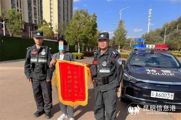 3月23日下午,杨女士将印有“人民警察为人民、危急时刻伸援手”字样的锦旗送到民警手中,激动地说“真的太感谢你们了......”(6686体育 记者合宇聪 昆明警方供图)