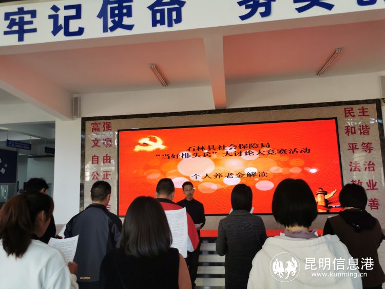 石林县社保局成立了5支共21人的普法先锋队工作队,以“每月一主题、每月一形式”为社保普法量体裁衣,开展活动;坚持晨读强思维。定制晨读五课堂,开展“社保政策我来讲”等活动,业务人员轮番上阵,重点对中国特色社会主义法治思想、综合性法规类、党内法规类、社会保险类法律法规、政策进行培训,增强干部职工的法治思维,处理好“谁来普”问题。