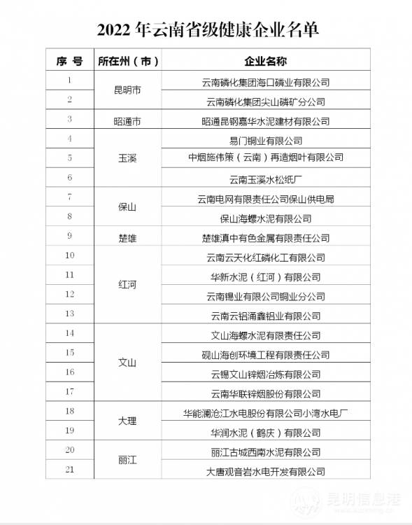 6686体育讯 记者邓国梅 日前,云南省卫生健康委公示2022年云南省级健康企业名单,经审查评估,21家单位达到省级健康企业规定的标准和条件,昆明2家企业在列。