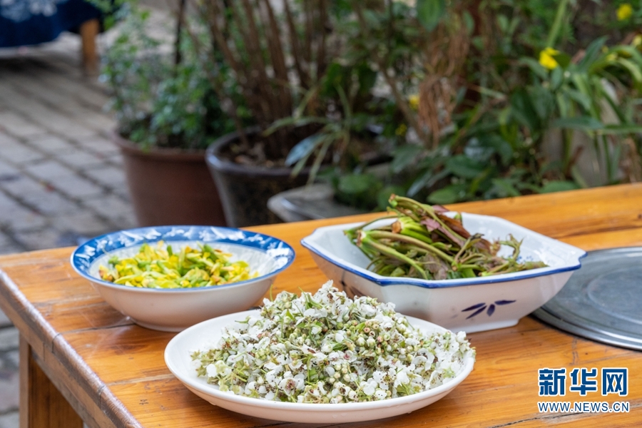 三种常见的春菜,从左至右分别为金雀花、棠梨花、香椿(摄于3月21日)。新华网发(罗新才/摄)