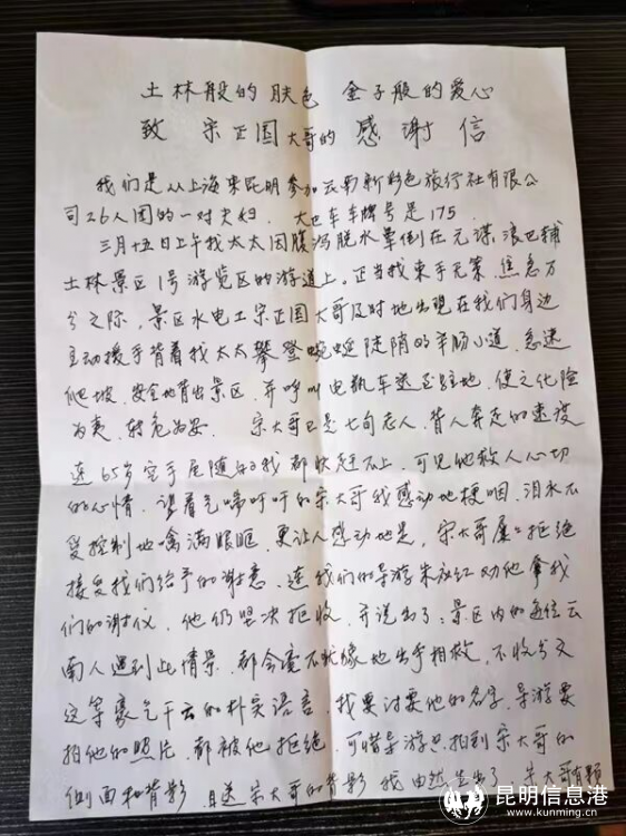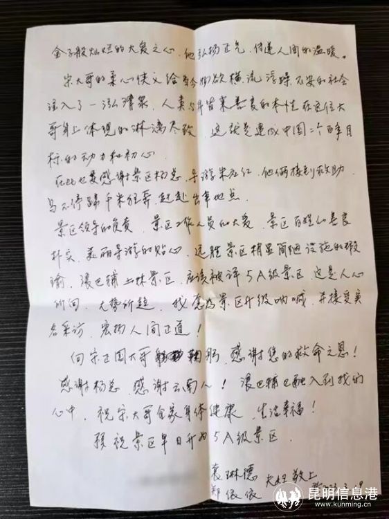 事后,袁琳德手书一封信,以表达自己的感激之情。信中大标题就是“土林般的肤色,金子般的心!”“宋大哥屡屡拒绝接受我们的谢意,并说‘景区内的每位云南人遇到此情景,都会毫不犹豫地出手相救,不收分文!’”景区的认真负责、工作人员的大爱、导游的贴心、景区百姓的善良朴实,都让袁氏夫妇云南之旅充满了感动。袁琳德说,云南的山美、水美、人更美,一定还会再来。