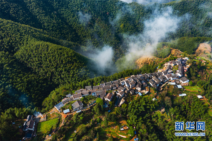 徽派民居,依山就势,呈阶梯状分布,古朴自然。植被茂密,水汽充沛,尤其是雨霁初晴,云海浮沉,烟雾缥缈。