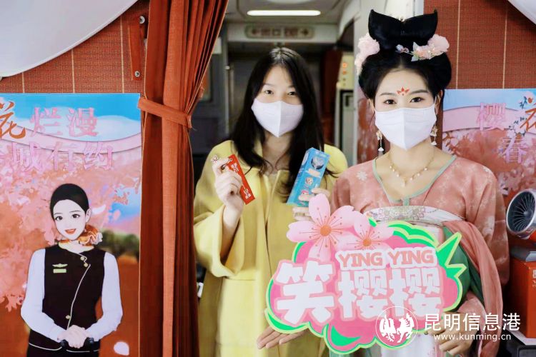 3月16日“樱花烂漫,春城有约”主题航班从福州开往“有花的地方”,穿着汉服的“樱花仙子”、樱花元素的座椅枕巾、小桌板、机舱行李架等氛围营造了浪漫的花海氛围,用讲武文创出品的樱花主题文创互动礼品为外地游客送上一份春城之礼,以樱花为礼,广邀四海佳朋做客昆明、畅游花海。