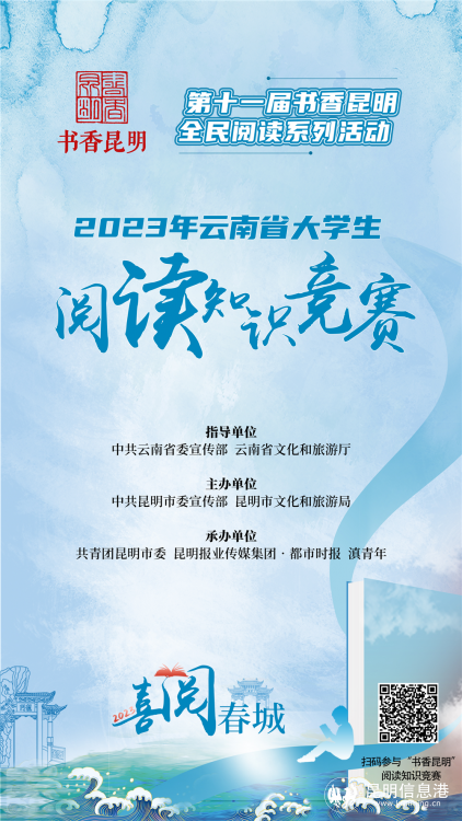 2023昆明市全民阅读大会暨第十一届“书香昆明”全民阅读系列活动——2023年云南省大学生阅读知识竞赛由中共昆明市委宣传部、昆明市文化和旅游局主办,共青团昆明市委、昆明报业传媒集团·都市时报、滇青年承办,并受到了云南民族大学、昆明理工大学、云南财经大学、昆明医科大学、云南农业大学等20多所高校社团组织的支持协助。