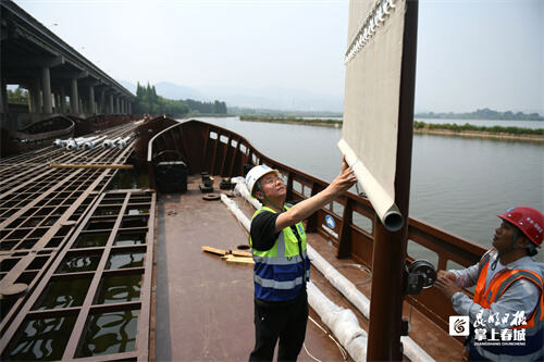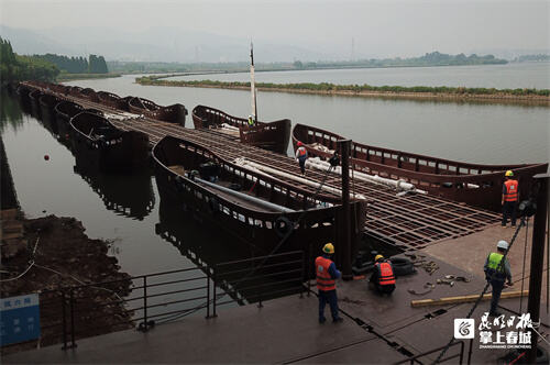 浮桥船体钢结构于3月9日开始架设,4月16日实现浮桥主体贯通,后续将开展桅杆风帆、景观照明、防护栏杆、通行地板等附属设施安装,做到一次成型、一次成优。