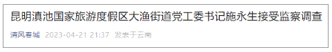 4月21日,据昆明市监委消息:昆明滇池国家旅游度假区大渔街道党工委书记施永生涉嫌严重职务违法,目前正在接受呈贡区监委监察调查。(昆明市纪委监委、清风春城)
