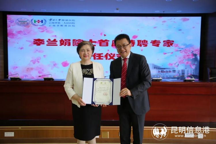 云南大学医学院常务副院长、附属医院院长韦嘉向李兰娟院士颁发了聘书,代表全院教医护干部职工,感谢李兰娟院士长期以来对云南省感染病学界、肝病学界及云南大学医学院、附属医院的学科建设给予的支持、关心和帮助。
