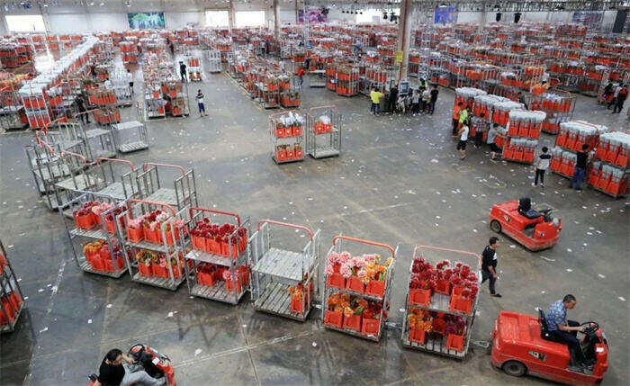 在墩子花卉市场,鲜花都以“车”这个数量单位进行交易。批发商根据玫瑰的品质、色泽度、有无病虫害等决定是否购买。交易完成后,再通过冷链物流将鲜切花迅速发往全国各地。春节以来,墩子花卉市场销售量持续上涨,在这里平均几秒钟就能完成一笔交易。
