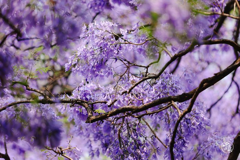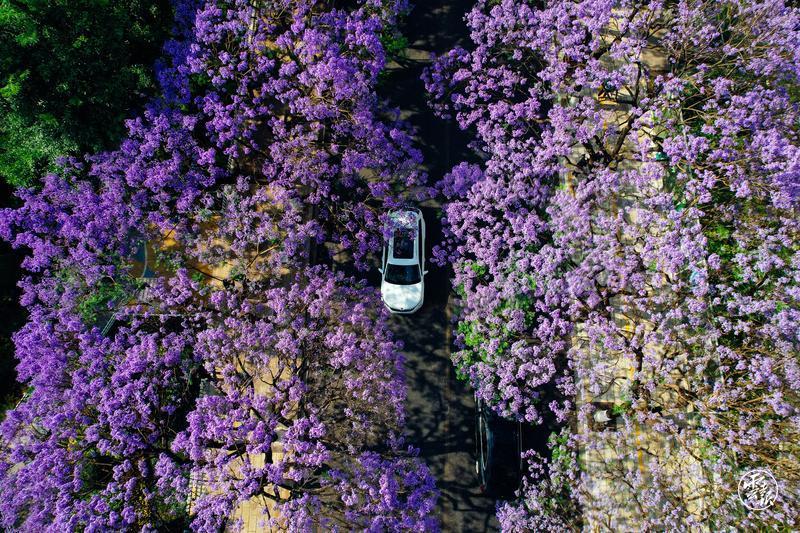 长约1.4公里的蓝花楹大道两旁,551株蓝花楹花事盛大,风铃般的花朵一簇簇地缀在枝头,随着暖风温柔地摇曳。前来拍照打卡的市民游客、摄影爱好者三三两两地漫步在花树底下,找寻最佳机位记录蓝花楹大道的美。路过蓝花楹大道时,几乎每一辆车都会放慢车速,车上乘客摇下车窗享受着行驶于花海之间的浪漫。