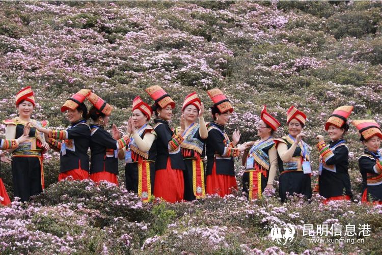 美丽的彝族姑娘在杜鹃花海中合影